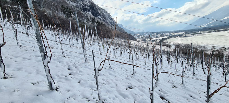 Unsere letzten Rebstöcke werden angebunden. Soweit wir zurückdenken können, haben wir diese Arbeit noch nie bei im Schnee gemacht. Jedes Jahr bringt neue Überraschungen. Anbinden im Schnee hat auch etwas Spezielles: beruhigende Stille und das sanfte knirschen im Schnee. In den Reben sind wir nun bereit für ein wundervolles Jahr 2021 und freuen uns auf den Austrieb der Rebstöcke.